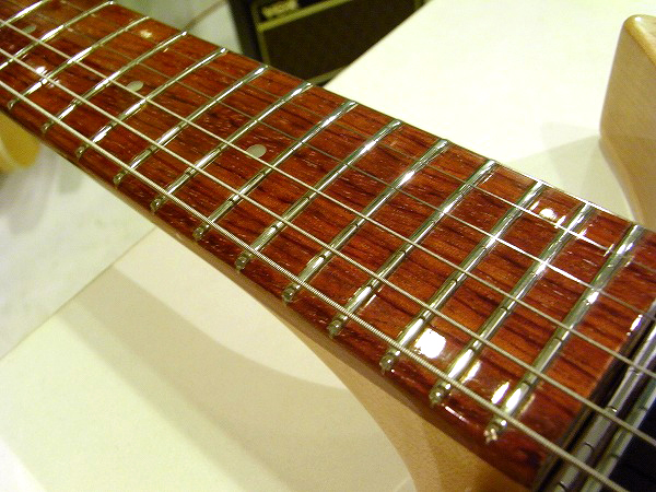 ネックもメイプルのセットネック、指板はローズウッドで、指板もクリアー塗装が施されているのが