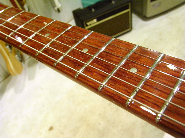 ネックは反りも無く、真っ直ぐにロッド調整済で、 ロッドは適正に調整後、まだ十分に余裕のある状態で、ほぼニュートラル状態。 今後の矯正も全く問題ありません。 フレットもほとんど減りは無く、ほぼ10割がた残っています。 弦溝やへこみも全く無く、新品同様に近い状態です。 さらに磨きも入れておりますので、光沢もピカピカの綺麗なコンディションです。 現在弦高は12フレット上1弦、6弦ともに1.5mmと非常にローアクションにセッティングしています。 上記のセッティングで、各ポジション、フレットバズ(ビビリ)や音づまりも無く良好な出音です。 非常に弦高も低く、とても弾きやすい状態です。 電気系統もチェック、清掃済で、ガリ等も無く良好な状態です。