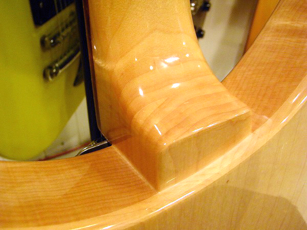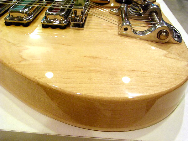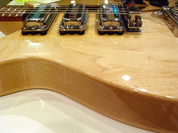 美しいメイプル材と、薄いラッカー塗装のクリアー塗装のメイプルのナチュラルカラーのボディに、