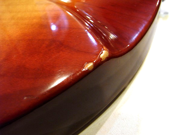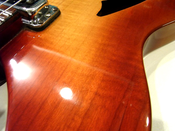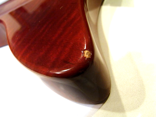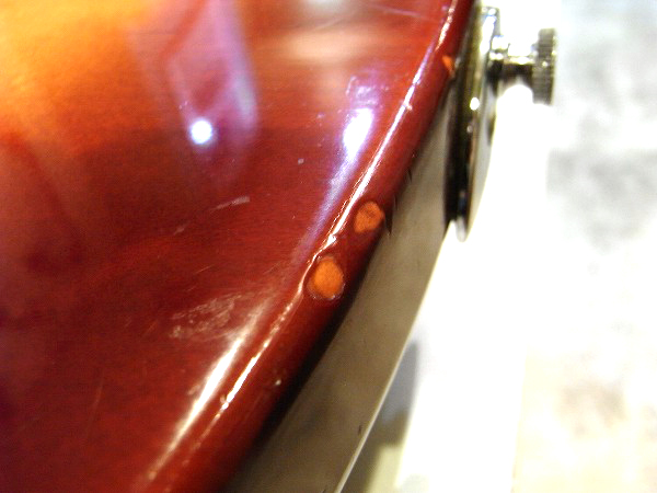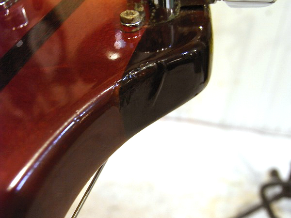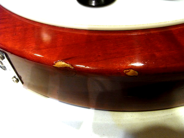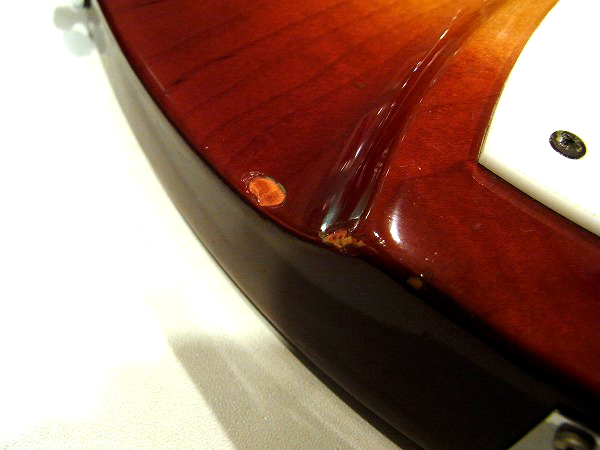 クリアー下のサンバーストカラーも大分大きく落ちている箇所もあり、木部が見えています。
