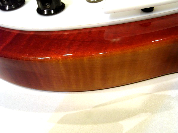 カラーは一番人気のファイアーグローで、美しいチェリーサンバーストの中からメイプルのトラ杢が浮かび、