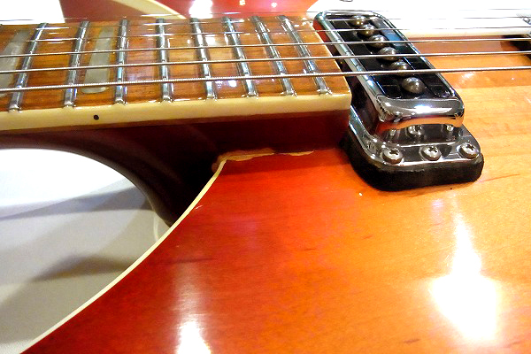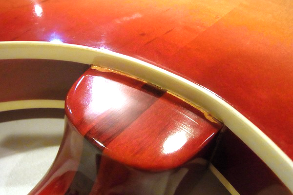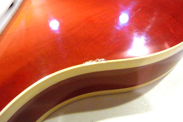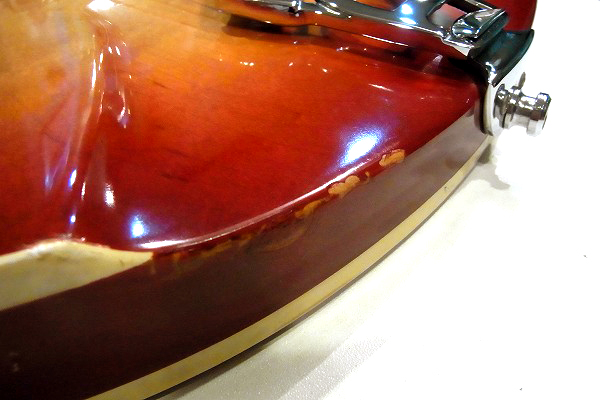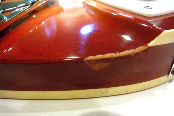 その他、トップ右側のエッジ部分バインディングにも、やや目立つ打痕と塗装剥がれがあります。