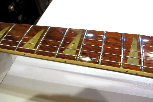 指板ポジションマークは通常330はドットインレイですが、こちらは三角インレイの仕様となっています。