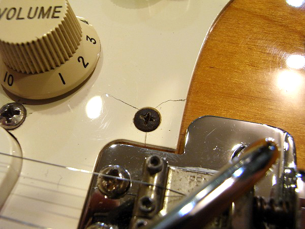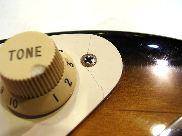 ピックガードのビス止め部の周辺にひび割れが出ている箇所が2ヶ所あります。