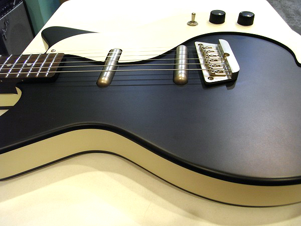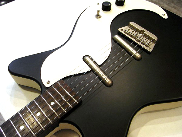 集積材のメゾナイトのホロウ構造のボディに、リップスティック・ピックアップを2発搭載。