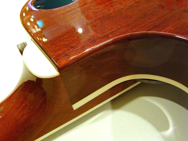 外観的にも大きなダメージは無く、非常に美品といって良いグッドコンディション! 各部クリーニング済で、コンパウンド、ポリッシュによる小さな傷の除去、光沢出しも行っておりますので、 塗装の光沢、ハードウェアの光沢ともにピカピカの状態です。 ただし、USED品ですので、使用感、小さな打痕、擦り傷等は若干ございます。 特筆すべき大きなものとしては、ボディエンドのバインディング部に1ヶ所打痕と変色がございます。 その他ヘッドの先端にいくつか打痕がある他、バックはやや擦り傷が多いです。 トップは大きな目立つ傷は無く、とても綺麗な状態です。 衣服や体との擦れによる、光に当てて角度を変えると見えるような細かな擦り傷はあるものの、