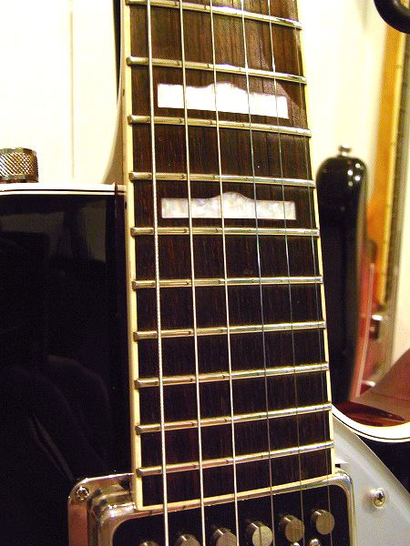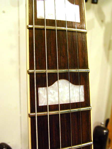 ネックは反りも無く真っ直ぐにロッド調整済で、 ロッドは適正に調整後、まだ十分に余裕のある状態ですので今後の矯正も可能です。 フレットも相応に減りはあるものの、まだ7分〜8分程度は残っており、 少しへこみがあるポジションもありますが、軽度で、ひどい弦溝等も無く、 まだまだ十分に使用出来る問題無い状態です。 磨きも入れておりますので、光沢も取戻し、綺麗なコンディションです。 現在弦高は12フレット上1弦1.5mm、6弦1.8mmとローアクションにセッティングしています。 上記のセッティングで、各ポジション、フレットバズ(ビビリ)や音づまりも無く良好な出音です。 弦高も低く、とても弾きやすい状態です。