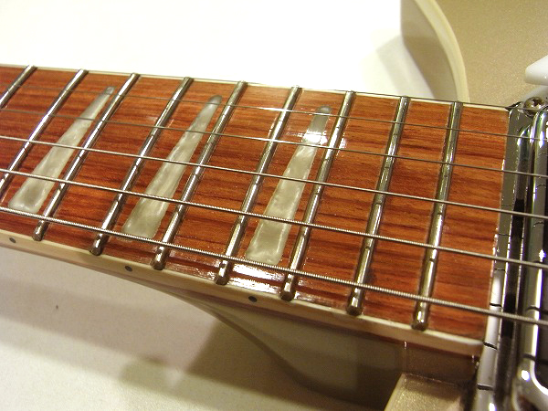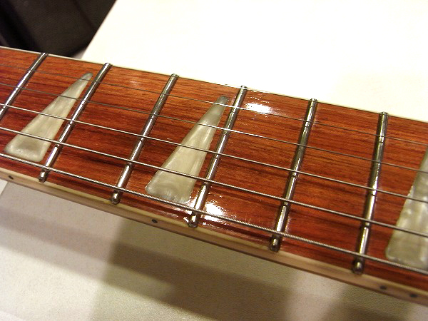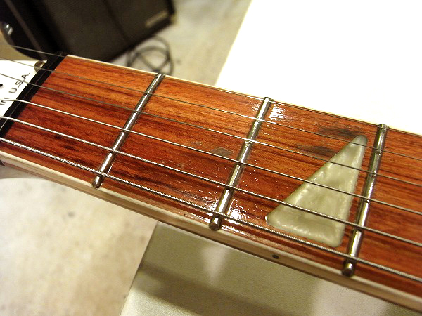 プレイコンディションは非常に良好です。 ネックは反りも無く真っ直ぐにロッド調整済で、 ロッドは適正に調整後、ロッド2本ともまだ十分に余裕のある状態ですので今後の矯正も可能です。 フレットは相応に使用上の減りはあるものの、 大きな減りは無く8分程度は残っています。 ローフレットに軽度のへこみがありますが、大きなへこみや弦溝は無く、ビビリやつまりもありません。 丁寧に磨きも入れておりますので、光沢も大分取戻し、 落としきれないくすみはごく小さく残っている箇所もありますが、ピカピカの綺麗なコンディションです。 バッチリ丁寧にセッティングも行っております。 現在弦高は12フレット上1弦1mm、6弦1.2mmと非常にローアクションにセッティングしています。 上記のセッティングで、各ポジション、フレットバズ(ビビリ)や音づまりも無く良好な出音です。 弦高も非常に低く、とても弾きやすいコンディションです。 これも山が高めのフレットならではの、現代的に使いやすい仕様ならではのローアクションです。 その他、電気系統もチェック、清掃済で、ガリ等も無く非常に良好な状態です。
