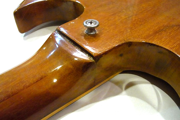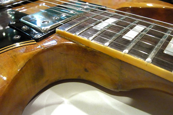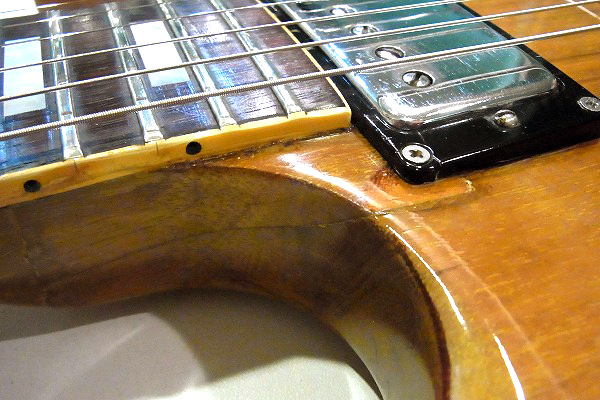 ネックとボディの接合部から一度折れ、ボディトップ面とサイド面に亀裂の跡があります。