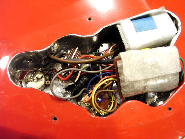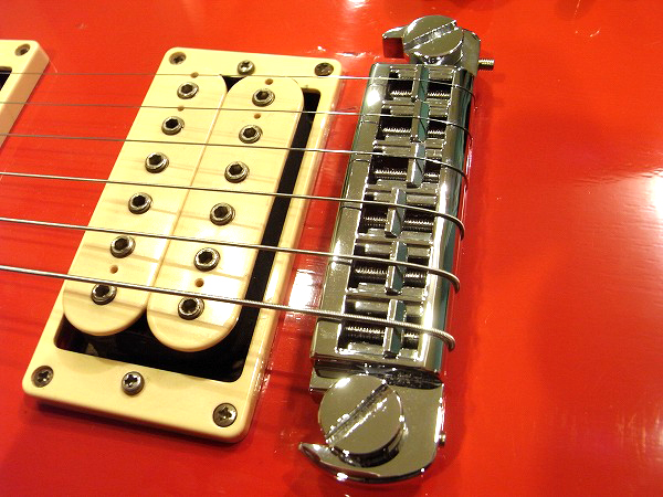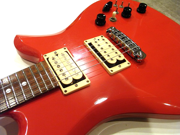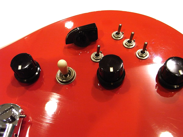 GOTOH製ハムを2発搭載。 リアはDimarzioタイプの6角ポールピースのタイプのハムとなっています。 そしてなんといっても特徴的な、多彩なスイッチ、コントロール。 Vol、Tone、ブースターのVolに加え、バリトーンスイッチ、ブースター、コイルタップ、フェイズスイッチと 非常に多彩なコントロール系を搭載しています。 鼻をつまんだようなフェイズトーンや、多彩なトーン、