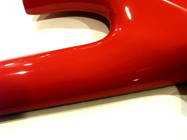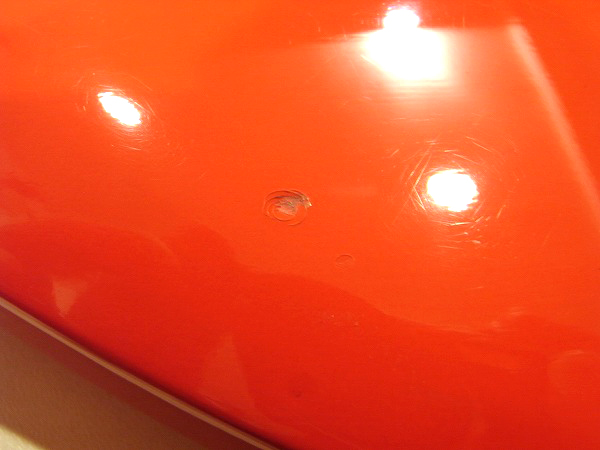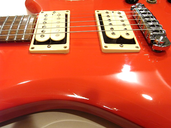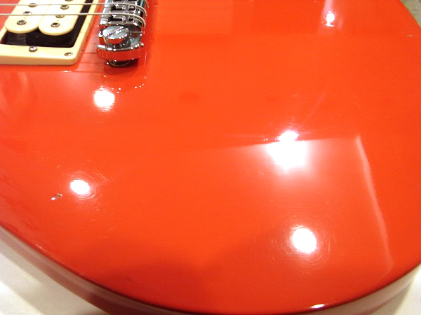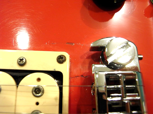 塗装剥がれや目立つ大きな打痕等、ひどいダメージはりませんが、 相応の年式の経ったUSED品ですので、若干の経年感、使用感、小さな傷、細かな傷はございます。 目立つものとしては、ボディトップに米粒大の打痕、それに伴う小さな塗装剥がれが数か所ございます。 また、一番大きなダメージとして、ブリッジ、ブリッジスタッドを変更した時に起きたと思われる、 スタッド近辺のボディのクラックがございます。あまり大きくは目立たず、 もちろん使用上も演奏上も全く問題の無い状態ですが、 それに伴うクラック、塗装部の表面の小さな剥がれが出ています。 それ以外はごく細かな擦り傷、小さな打痕程度で、大きなダメージも少なく、 全体的には年式を考慮すると非常に美品と言って良いグッドコンディション品です。