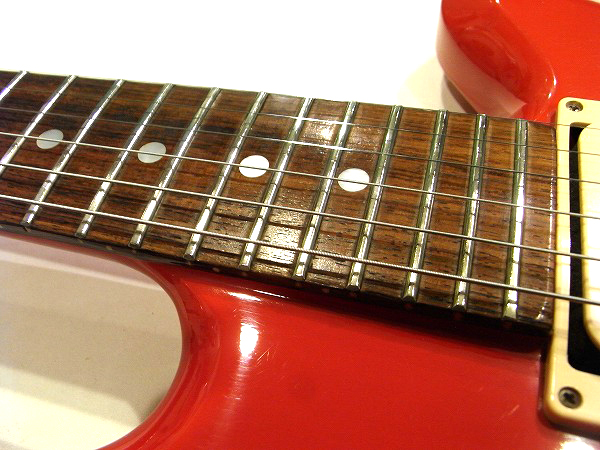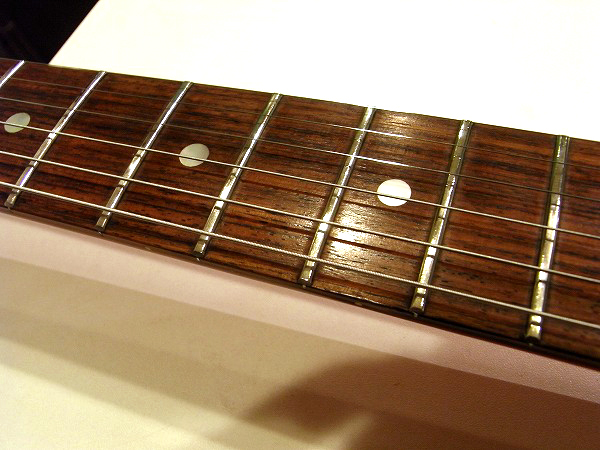 プレイコンディションは非常に良好です。 ネックは反りも無く真っ直ぐで、ロッドはニュートラルの状態で、十分に余裕があり、 今後の調整も全く問題ありません。まだ一度も回していない新品同様の状態です。 フレットは相応に減りはあるものの、まだ7分程度は残っており、 すり合わせも行っておりますので、弦溝やへこみもありません。 さらに丁寧に磨き、クリーニングも入れておりますので、光沢もピカピカのコンディションです。 バッチリ丁寧にセッティングも行っております。 現在弦高は12フレット上1弦1.2mm、6弦1.5mmと非常にローアクションにセッティングしています。 上記のセッティングで、各ポジション、フレットバズ(ビビリ)や音づまりも無く良好な出音です。 弦高も低く、とても弾きやすいコンディションです。 電気系統も非常に良好で、各コントロール、スイッチ共に正常に動作し、 ガリ等も無く非常に良好な状態です。9V角電池を1本使用します。