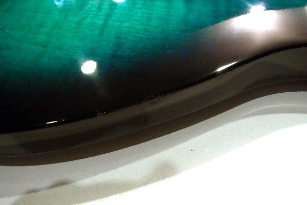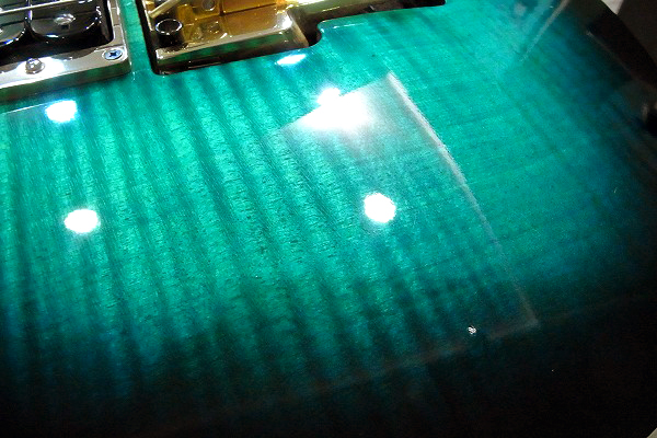 やや緑がかった美しいブルーのシースルーカラーから、ストライプの激トラ杢が浮かび上がっており、