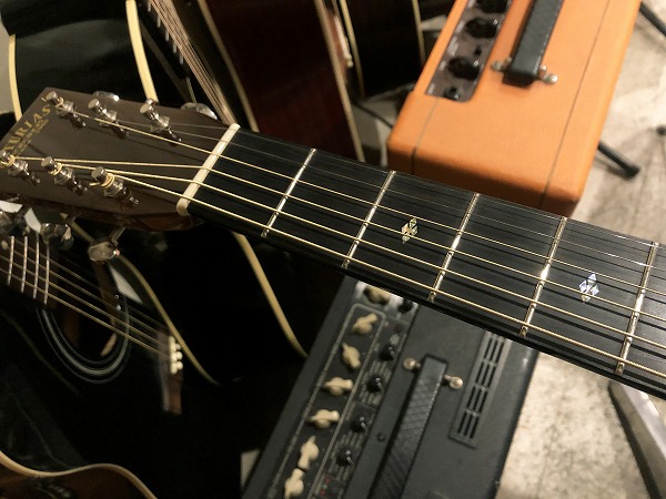 プレイコンディションは非常に良好です。ネックは反りも無く真っ直ぐで良好な状態です。ロッドはまだ十分に余裕がありますので、今後の調整にも対応します。フレットも大きな減りは無く、まだ8分〜9分程度は残っており、大きなへこみや弦溝もなく、さらに丁寧に磨きも入れ、光沢のあるとても綺麗なコンディションになっています。指板も大きな減り、傷、ダメージはなく、指板もさらに丁寧にクリーニングの上、コンディショニングも行っておりますので、綺麗で良好なコンディションになっています。ナット、ブリッジ溝も大きな減りも無く、良好な状態です。ネック起きやブリッジ浮き、トップのふくらみもありません。しっかりとメンテナンス、セットアップも施しておりますので、弾きやすく、ビビリやつまりも無く、良好な出音です。現在弦高は12フレット上1弦1.6mm、6弦2mmのローアクションで弾き心地抜群です。ペグ動作も問題無く、良好なコンディションです。各所調整・セッティング済の、弾きやすく出音良好の、非常に良好なプレイコンディションです。