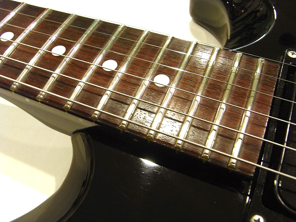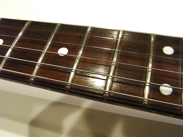 ネックは反りも無く真っ直ぐにロッド調整済で、 ロッドは適正に調整後、まだ余裕のある状態ですので、今後の矯正も問題ありません。 フレットも大きな減りは無く、まだ8割がた残っており、弦溝やへこみもありません。 丁寧に磨きも入れておりますので、光沢もピカピカの綺麗なコンディションです。 現在弦高は12フレット上1弦1mm、6弦1.2mmと非常にローアクションにセッティングしています。 非常にローアクションなこのセッティングも、ミディアムジャンボフレットとスクエアな山ならではです。 上記のセッティングで、各ポジション、フレットバズ(ビビリ)や音づまりも無く良好な出音です。 非常に弦高も低く、とても弾きやすい状態で、調整済、各セッティングもバッチリの状態です。 電気系統もチェック済で、各コントロール正常で、ガリ等も無く非常に良好な状態です。