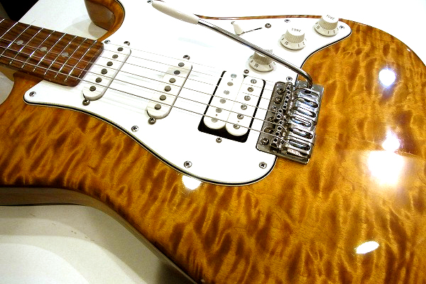 写真を見ていただいても分かるかと思いますが、 トップは薄いつき板ではなく、5mm厚の、厚みのある無垢のキルト・メイプルです。 トップはセンター2ピースです。 激キルトの鮮やかな木目が、ハイブランドならではの高級感と上質感を高めています。 ボディバックはアルダーです。こちらも良いアルダー材が使われています。 ネックはメイプル、指板は希少な高級木材として知られるハカランダが使われています。 堅牢なハードメイプルに、美しい木目のハカランダ指板、 各材ともにさすがは最高峰ブランドならではの上質感です。