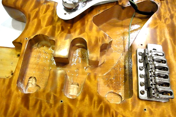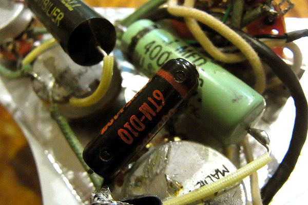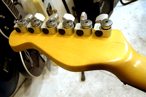 グリーン、 さらにスプラグのブラックビューティーが搭載されています。 ポットは国産ですが、配線材にも70年代のものが使われています。 さらにブリッジは評価の高いウィルキンソンのVSVG、ペグはスパーゼルのロックペグを搭載。 全体的に前オーナー様の拘りを感じさせる上質で豪華なカスタムとなっています。 そしてもちろん、塗装はオールラッカーで、トップはラッカーならではの塗装の薄さ、質感も感じられます。