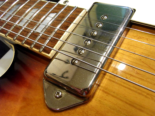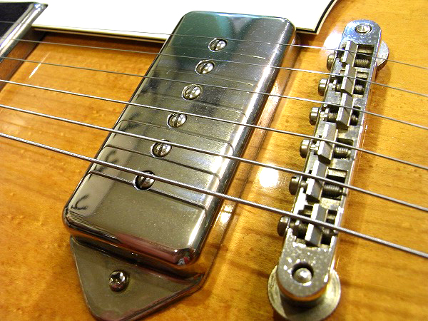 CASINOはセミアコの様なボディ厚、ボディサイズながら、センターブロックが無いのが非常に特徴的で、 ボディ内部は空洞になっており、正確に言えばフルアコ構造を持ったモデルです。 このフルアコ構造のボディと、P-90ピックアップのマッチングがCASINO最大の特徴的サウンドを生み出しています。 フルアコならではの豊かな箱鳴り感で、あたたかみのある太いサウンドと空気感が得られ、 トーンはP-90シングルピックアップならではのエッジもあり、ハイトーンの抜けも良く、音も太いといった、 ハムとシングルの良いとこ取りなトーンとのマッチングで、非常にグッドサウンドなモデルです。 ボディ、ネックに非常に良質なメイプルが使用され、丁寧にしっかりと作られている事で、 トーンに芯とハリがあり、とてもはっきりとした音色でタイトなサウンドなのも特徴的です。