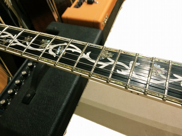 プレイコンディションは良好です。ネックはロッド調整済みで反りも無く真っ直ぐで良好な状態です。ロッドもまだ十分に余裕があります。フレットは若干の使用感、減りは見られるもののまだ7分程度は残っており、大きなへこみや弦溝も無く、ローアクションセッティング可能で出音も良好です。フレットは丁寧に磨きを入れ、大分光沢も取り戻し、綺麗なコンディションになっています。指板も大きな減りやダメージは無く、指板も丁寧にクリーニング、磨きも行っており、綺麗で良好なコンディションになっています。
