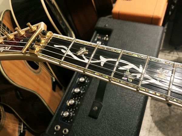ディンキーシェイプの細身のストラトシェイプで取り回し良く、カッタウェイは深く、ヒールレス加工も施され滑らか、非常にハイポジションも弾きやすく、スムースな運指に対応、フレットはなんと27フレット仕様でハイポジションでのより幅の広いテクニカルプレイ、早弾き等にも対応しています。基本的な作りはスルーネック仕様となっており、ネックはウォルナット+ハードメイプルの7ピースという堅牢な作りに、両サイドのボディのウィング部にアッシュを使用、さらにトップには非常に美しいキルトメイプルトップを使用、指板も高級木材であるエボニーを使用、といった大変贅沢かつ凝った作りのモデルです。ルックスも大変ゴージャスです。トップのくっきりと木目の入った豪華なキルテッドメイプルはもちろん、ボディバインディングにはアバロンが施され、指板インレイには全面にリーフインレイ、さらにボディ同様ホワイトとアバロンのバインディング、各種ハードウェアはゴールドという、大変ゴージャスな仕様のルックスです。見た目のゴージャスさだけでなく、前述のヒールレス・カッタウェイ加工はもちろん、ネック裏はナチュラルのマットフィニッシュですべすべの滑らかな弾き心地、演奏性も非常に考慮され設計されています。ブリッジはフロイドローズタイプ+ロックナット仕様で、激しいアームプレイにも安定したチューニングで対応します。