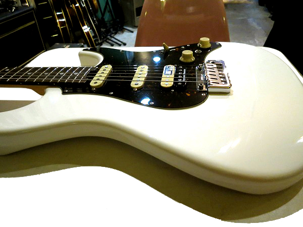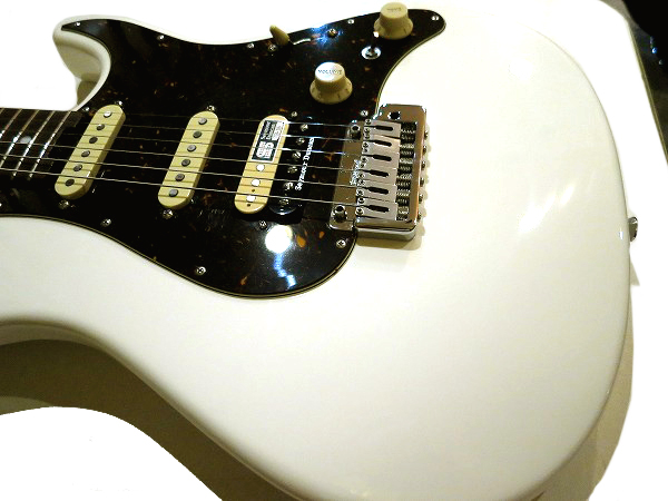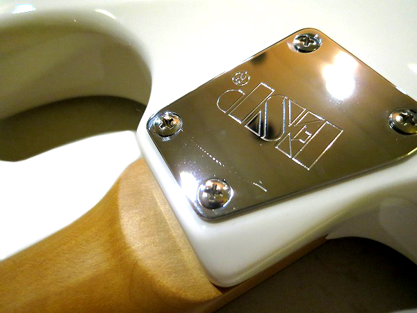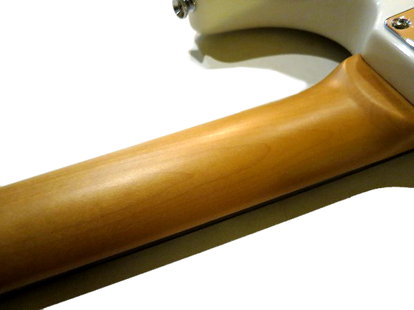 深めのカッタウェイとややエッジのあるシャープな突き出し部を持ち、 バックコンター、エルボーカットに加え、ネックジョイント部のヒールレス加工、 カッタウェイ部のコンターカット等、抱えやすく、演奏しやすく、 ハイポジションでの弾きやすさ、演奏性まで考えられ設計された 非常にプレイアビリティの高いストラトタイプボディースタイルで、 ボディ木材はアルダーです。 ネックはメイプルにローズウッド指板で、 突出しスラブボードの22フレット仕様、指板はフラットに近い緩やかなアール(305R)で フレットはミディアムジャンボと、こちらも高い演奏性と安定した音程感/ピッチ、 豊かなサステインを考慮され、設計されています。 ブリッジは2点式のウィルキンソントレモロ、ペグはGOTOHのマグナムロックペグと