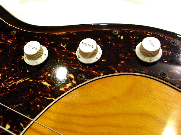 ボディはおそらくセンと思われますが、1ピースボディで木目も綺麗な良い木材。 ネックはメイプル、ローズウッド指板です。 各木材、作りも良く、さすがは当時コピー系ブランドの中でもワンランク上のブランド感を感じさせます。 ピックアップはカバードのシングルで、ややハイの立ったブライトなサウンドが特徴的です。 センのタイトですっきりとした低音の効いたサウンドと相まって、