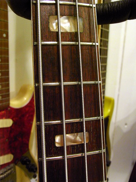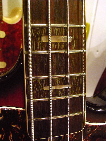 ネックは反りも無く、真っ直ぐにロッド調整済です。 ロッドはまだ回りますが、年式が古い事と、元々の仕込み・精度の問題もあり、 回りは非常に硬く、効きもあまり良くありません。 ネック自体は現在は使用上良好なコンディションですので、問題無くお使いいただけます。 フレットは相応に減っており、5分〜6分程度となっていますが、大きな弦溝やへこみは無く、 磨きも入れておりますので、光沢も大分取戻し、良好な状態です。