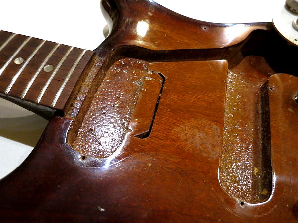 ピックガードは経年により変色している他、点状のシミの様な経年変化が出ています。