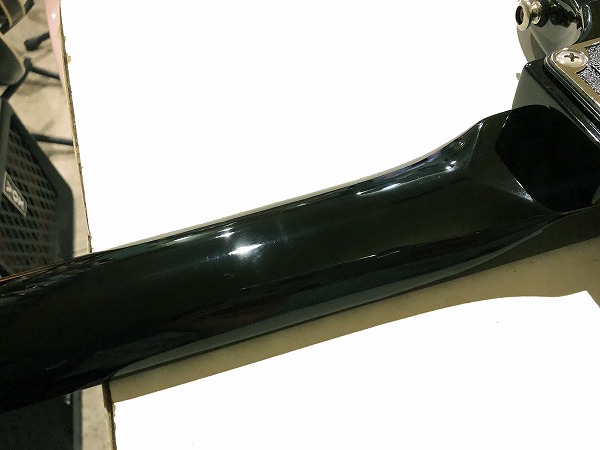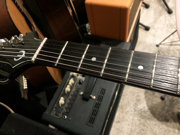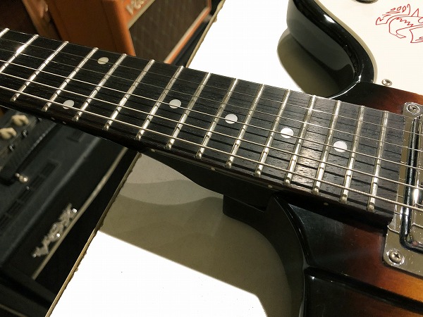 プレイコンディションは良好です。ネックはロッド調整済みで反りも無く真っ直ぐで良好な状態です。フレットは相応に減り、使用感はあり、軽度のへこみも見られますが、まだ8分程度は残っており、大きなへこみや弦溝はありません。フレットは丁寧に磨きも入れ、光沢も大分取り戻し、綺麗なコンディションになっています。指板も若干の使用感、小傷は見られますが、大きな減りやひどいダメージは無く、使用上も良好なコンディションです。丁寧にクリーニング、磨きも行っており、こちらも綺麗で良好なコンディションになっています。