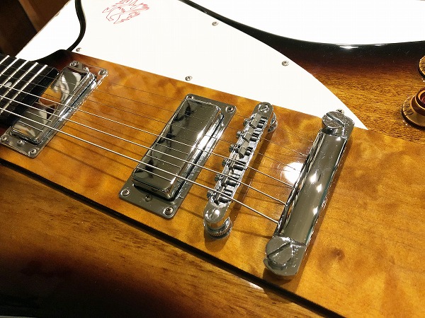 基本的には本家Gibson Firebird Vの仕様を踏襲したモデルで、Gibson直系傘下のEpiphoneブランドだけあり、その再現性は高いです。Firebirdならではのシェイプ、ピックガードのバードマーク、ミニハムバッカー搭載のピックアップ・レイアウトなど、本家Gibson