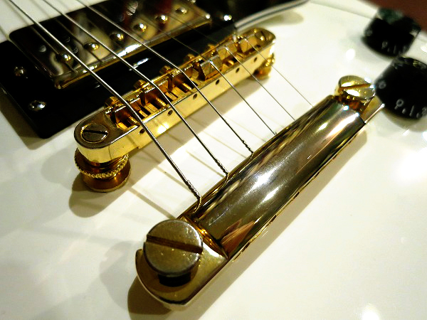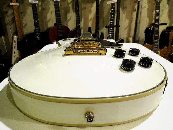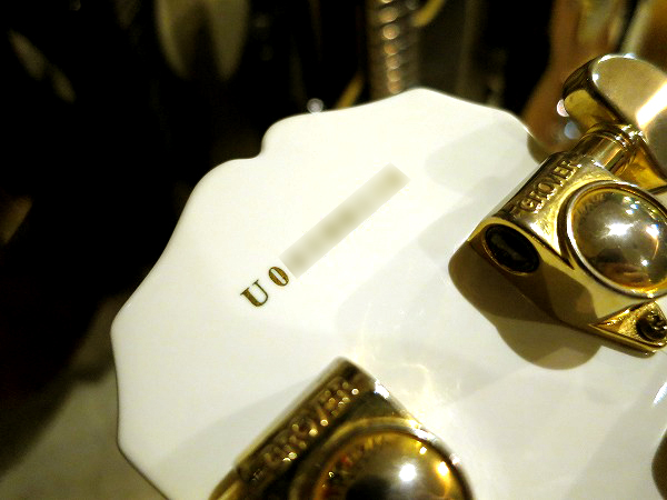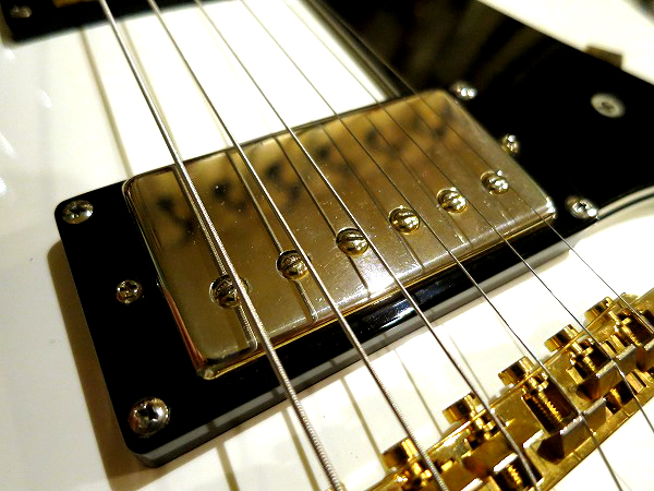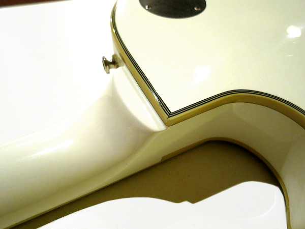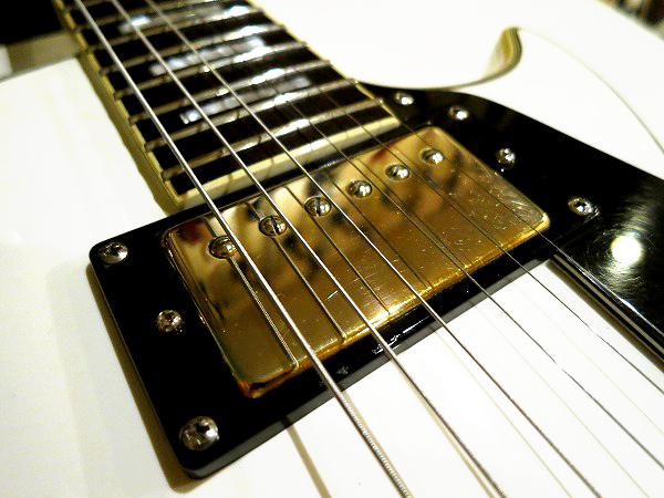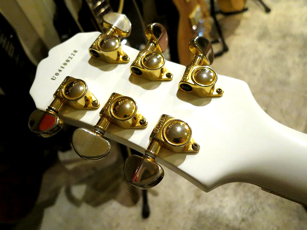 ボディ、ネック、ヘッドにはバインディング付、ホワイトのカラーリングにゴールドのハードウェアと、