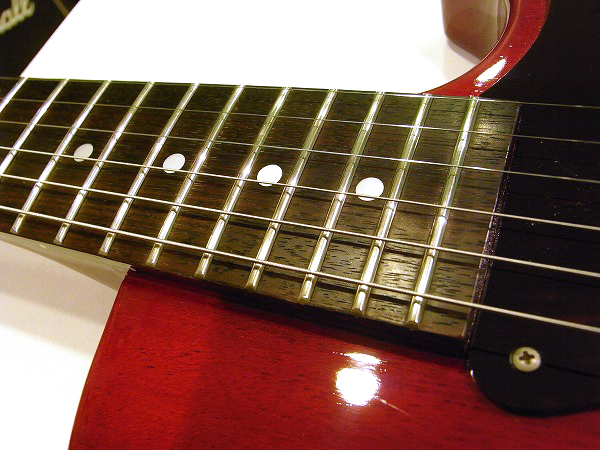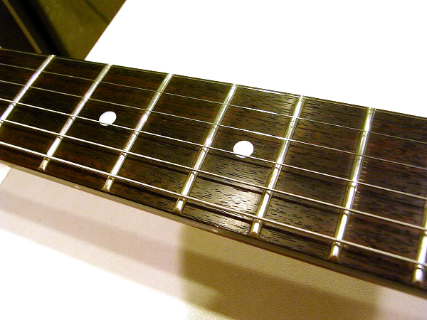 ネックは反りも無く真っ直ぐにロッド調整済で、 ロッドは適正に調整後、まだ十分に余裕のある状態ですので今後の矯正も可能です。 フレットもほとんど大きな減りは無く、10割がた残っており、 弦溝やへこみ等も無く、全く問題無い状態です。 さらに丁寧に磨きも入れておりますので、ピカピカの綺麗なコンディションです。 指板、ナットのコンディションも非常に良好です。 現在弦高は12フレット上1弦1mm、6弦1.2mmと非常にローアクションにセッティングしています。 上記のセッティングで、各ポジション、フレットバズ(ビビリ)や音づまりも無く良好な出音です。 弦高も低く、とても弾きやすい抜群の弾き心地です。