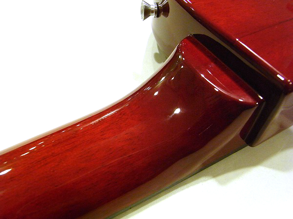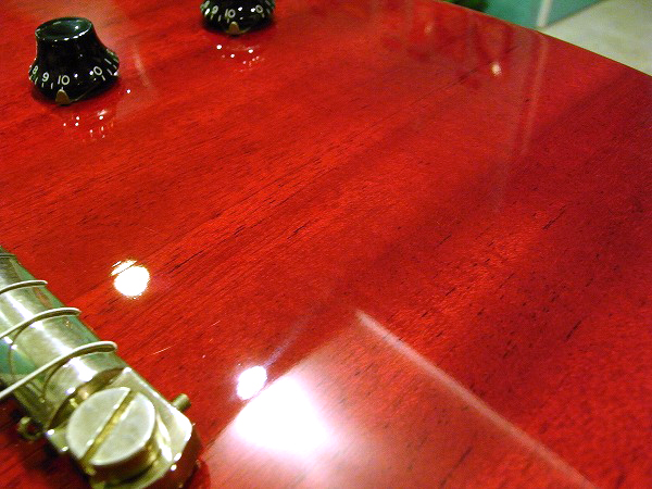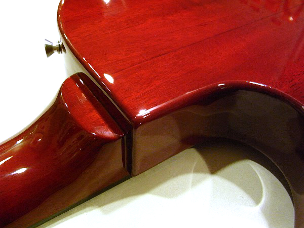 その場合今度はトーンにハリが無くなってしまいます。 その為、非常に薄く塗る事が出来るオールラッカーでの塗装が、 木材の鳴り、ボディ鳴り、トーンのハリ全てにおいて一番良いとされています。 実際、この1本は本来このクラスでのモデルではあり得ないラッカー塗装仕様で、 非常にボディ、ネック共に鳴り、ギター本体の鳴りが良く、トーンも適度にハリがあり、乾いたトーンとなっており、