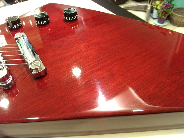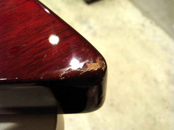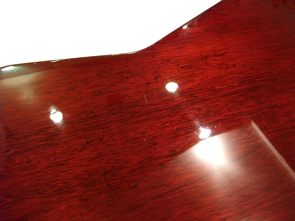 ボディ木部に染み込んでしまっている為、サインが薄く残っています。 それ以外はごく小さな打痕、小さなへこみ傷、細かな擦り傷程度で、 大きなダメージも無く、まだまだ綺麗なコンディションです。 ハードウェアも丁寧に磨きを入れ、ピカピカの綺麗なコンディションです。 全体的には、前述の先端の塗装剥がれやバックの薄いサインの残りを除けば、 大きな目立つ傷も少なく、塗装の光沢も出ていますので、まだまだ綺麗なコンディションです。