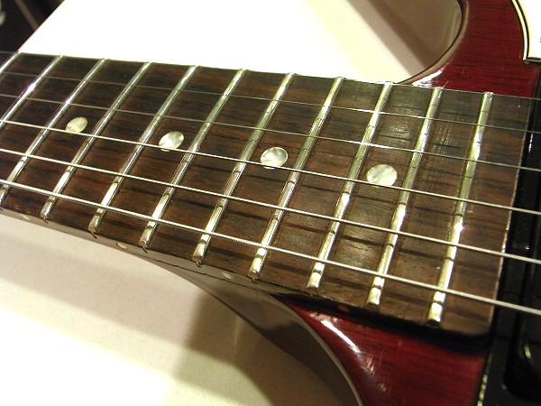 今後のロッド調整も問題ありません。ネックコンディションは非常に良好です。 また、それに伴い、フレットすり合わせも行っておりますので、フレットの状態も非常に良好です。 もちろん弦溝やへこみもありません。 すり合わせ後の残りもまだ十分にあり、8分程度は残っています。 さらに丁寧に磨きも入れておりますので、光沢も取戻し、ピカピカの綺麗なコンディションです。 現在弦高は12フレット上1弦1.2mm、6弦1.5mmと非常にローアクションにセッティングしています。 上記のセッティングで、各ポジション、フレットバズ(ビビリ)や音づまりも無く、良好な出音です。 弦高も非常に低く、とても弾きやすいコンディションです。 その他、電気系統もチェック、再配線、清掃済です。 入荷時、配線の接触に劣化、ガリが出ておりましたので、 丁寧に再配線を行い、ガリも除去しました。 現在は各コントロールガリ等も無く、非常に良好な状態です。 コントロールはノーマルのままで、各ヴォリューム、1トーン、ピックアップセレクターとなっています。