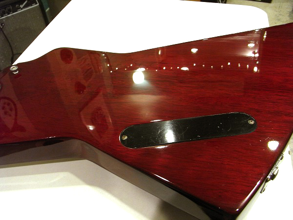 Explorerを再現したモデルです。 ボディはマホガニー、ネックもマホガニーのセットネック仕様で、指板はローズウッドです。 ピックアップはハムを2発搭載、コントロールは2Vol、1Tone、1トグルスイッチ(ピックアップセレクター)、