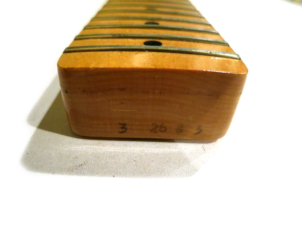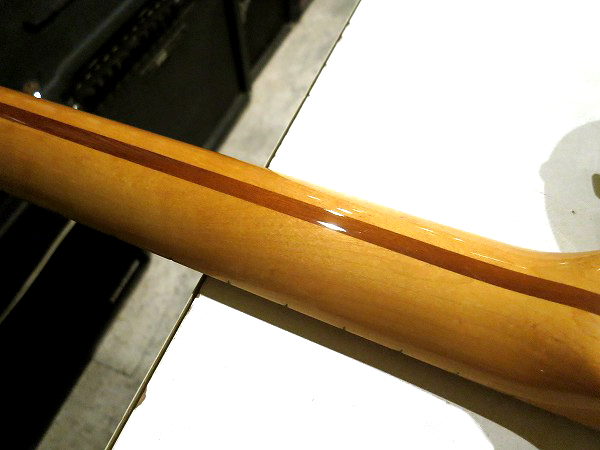 基本はヴィンテージ・テレキャスターをベースにしたモデルですが、 独立の6サドルや、やや太めのフレット、ややフラットな指板アール等、 よりモダンな仕様を持ったモデルで、 より安定したサウンドと演奏性が求められるようになった、当時のシーンに対応しています。 ボディはアルダー、ネックはメイプル1ピースで、いずれも良質な木材が使用されています。 重量3.81kg(デジタルはかり計測)とやや重めですが、 その分しっかりとした質量で、ハリと芯のあるサウンド、トーンと鳴り感は抜群で、 非常に激鳴りの当たりの1本です。 ネックのメイプルは所々に少々バーズアイも入っています。 良いメイプルが使用されています。 ネックエンドのネックデイトは「3