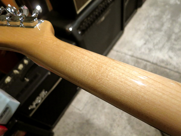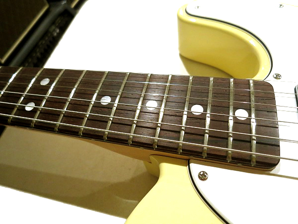 Shopによるヴィンテージ・リイシュー系モデル、 今回入荷したのは2011年限定生産の希少レアモデル、1967年仕様のテレキャスターです。 メイプルネック+ラウンドボード・ローズウッド指板、ハード・セレクテッド・プレミアム・アルダーボディで 木材はいずれも、木目、導線、色味も非常に上質な、トップクラスの木材が使用されています。 ネックはラージCシェイプでやや丸みのあるしっかりとしたネックシェイプで、 太いサウンド、抜群の鳴り感を実現しています。生鳴りも非常に良いです。 ネック、木が響いている感じですね。 この年代の特長であるラウンドボードはラディアス