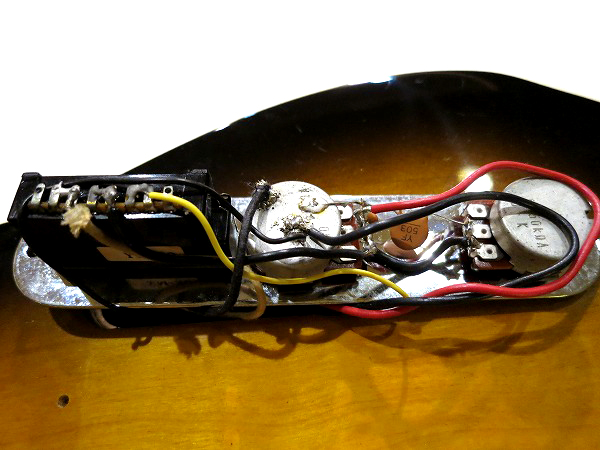 この交換に伴い、ピックガードとボディに穴を大きくするザグリ加工が施されています。