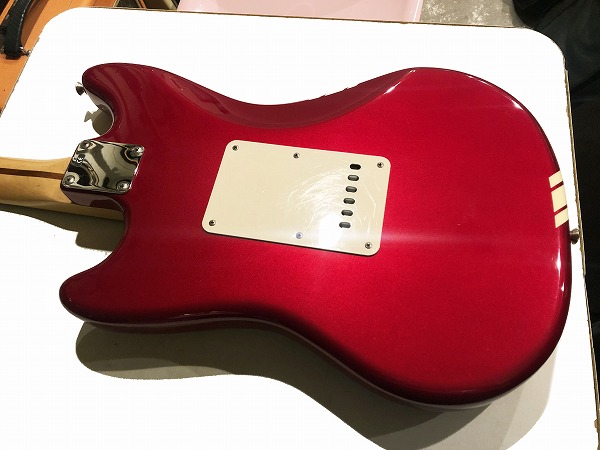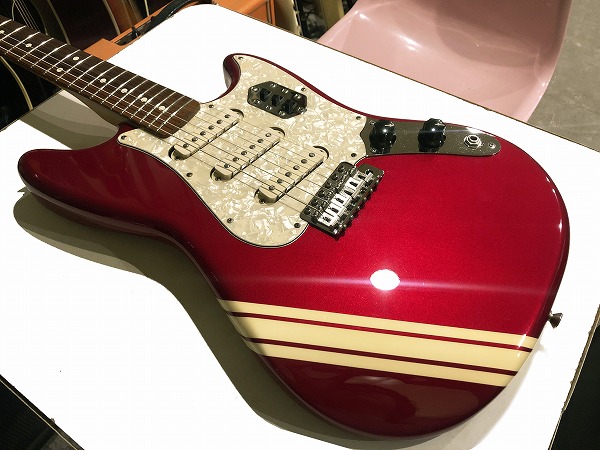 1Toneです。カラーはCandy Apple Redで、コンペティション・ムスタングのようなレーシング・ストライプが入っており、トラディショナルかつクールなルックスも大きな魅力の1本です。
