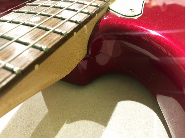 外観的には軽度の小傷、使用感、経年感はあるもののまだまだ良好なグッドコンディションです。ボディや金属パーツ、軽度の小傷や擦り傷、若干の経年感はあるものの大きな打痕や大きな塗装剥がれは無く、塗装の光沢もまだまだあり、まだまだ綺麗なグッドコンディションです。ボディカッタウェイ部分に塗装のひび割れクラックがありますが、木部には大きなダメージは無く、演奏上、使用上も問題ありません。ネック、ヘッドは使用による若干の黒ずみや小傷はありますが、こちらも大きなダメージ無くまだまだ良好なコンディションです。全体的に丁寧にクリーニング、磨きも入れており、とても綺麗なコンディションになっております。アームバーは欠品しています。コントロールノブは1つ同タイプのものに交換されています。こちらもルックス的にも使用上も問題ありません。ケースはおまけとしてソフトケースをお付けいたします。