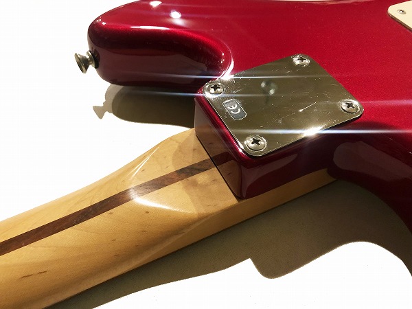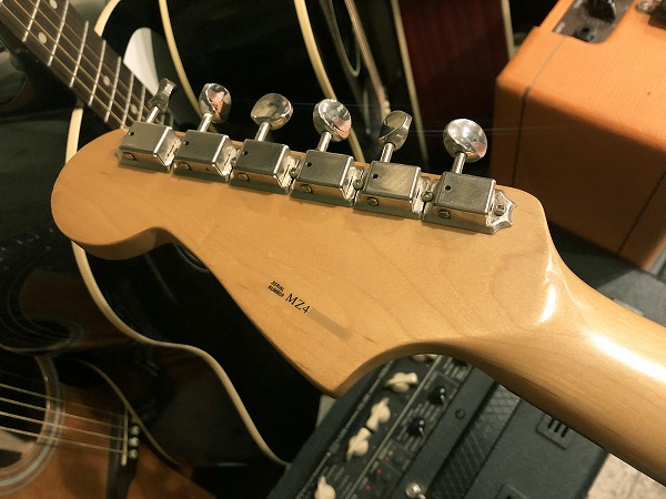 今回入荷したのはCandy Apple Redカラー、ヘッド裏シリアルは「MZ4******」の2004年製の1本です。基本スペックはアルダーボディにメイプルネックのボルトオン仕様、ローズウッド指板に、ブリッジは6点止めシンクロトレモロタイプ、ペグはクルーソン・タイプとなっています。スケールは24