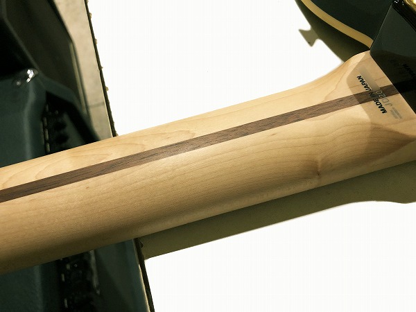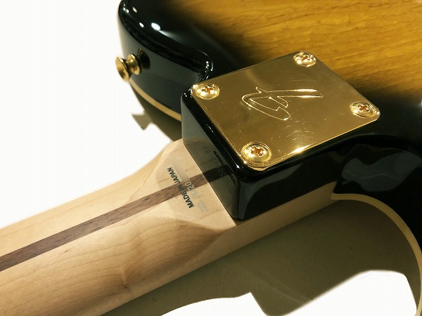 ボディはアッシュバックに美しいピンストライプのフレイムメイプルのトップ、カラーはブラウンサンバーストで美しい木目も引き立ち、存在感と高級感溢れるルックスです。トップは全面にピンストライプのトラ杢がビッシリと入っており、バックのアッシュも木目も綺麗な非常に良質なものが使用されています。ネックはメイプル1Pでフィニッシュは塗装無しのサテンフィニッシュで、すべすべとした滑らかさで弾き心地の良さも抜群です。ネックシェイプも個性的で、かなり太め、丸太タイプのCシェイプとなっています。細身のネックに慣れた方には最初は弾きにくいかもしれませんが、氏のテクニカルなプレイをしっかりサポートするシェイプです。また、そのファットで太いサウンドと豊かな鳴り感は魅力です。生鳴り感も抜群です。フレットはスーパージャンボ・フレットで、安定したピッチ、音程感、伸びやかで豊かなサステインを提供し、こちらも確実なプレイをサポートします。22フレット仕様、ポジションマークはアバロン、各ハードウェアはゴールドと、ルックス的にもゴージャスです。ブリッジは6ブロック・サドル仕様で、各弦のオクターブ調整、弦高調整も可能です。フェンダー・トラディショナルなスタイル、品の良さ、格の高さ、個性的なスタイルを併せ持ったシグネチャーモデルとなっています。