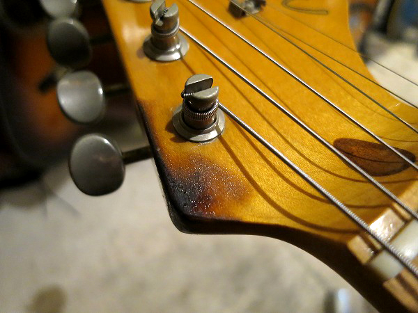 ヘッドの先端部、6弦ペグ下のエッジ部分にはタバコの焼け焦げ跡が付けられています。