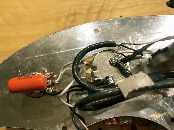 Mexicoの80年代後半製の同タイプハムが搭載されています。こちらも上記オリジナルほどではないものの、スッキリとしたクリアーさと耳に痛くないトーンで、経年と使用によるこなれたいなたいトーンとなっており、とてもグッドサウンドです。センターでの玉のような粒立ちの良いトーンも格別です。さらにヴォリュームポットはCTS、コンデンサーはオレンジドロップに換装されています。(このモデルに搭載されていたオリジナルのピックアップ、電装パーツは付属しません。)