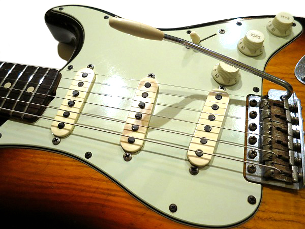 ピックアップはグレイボビンタイプのもので、フロントとセンターはスタガード・ポールピース、