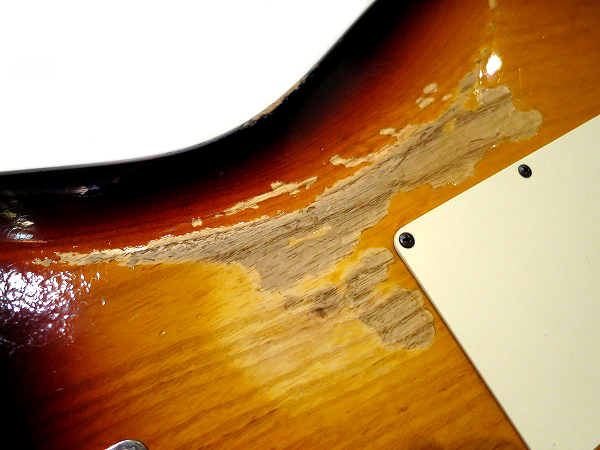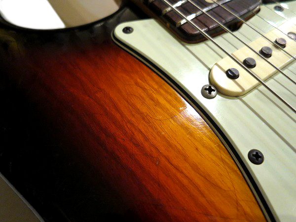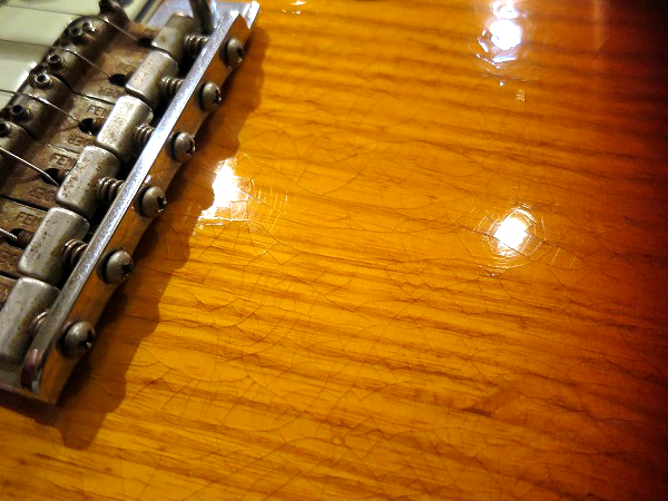 ボディには細かなウェザーチェック(ヴィンテージに見られる塗装の乾燥による細かなひび割れ)が施され、