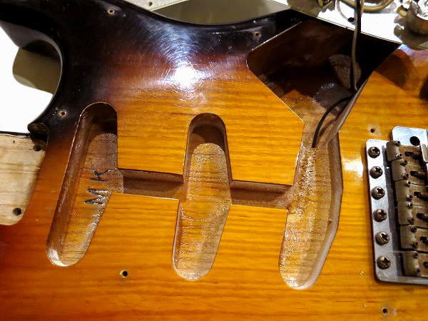 ボディのフロントピックアップのザグリ部分には「MK」の刻印、