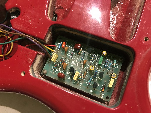 ピックアップにはレースセンサー・ゴールドを搭載。レースセンサー・ゴールドは非常に根強いファンの多い評価の高い名ピックアップで、単体で使用される事も多いモデルです。ヴィンテージライクで煌びやかなクリアーなハイといわゆる美しいベルトーンと、ノイズの少ないサウンドを両立しているのが大きな特徴です。ほど良いコンプ感もあり、とてもこなれ感とまとまり感がありとても使いやすく、追い込んだ音作りをしなくても簡単に良い音が出せるのも魅力です。さらにクラプトンモデルの大きな特徴であるTBXコントロールとアクティヴ・ミッドブーストも搭載。また、こちらはミッドブーストはVolの位置にPUSH-PULLスイッチでON-OFF出来る様にカスタムされており、アクティヴ-パッシブでの切り替え使用も可能です。TBXコントロールはどちらにも効きます。3つ目のTONEがミッドブーストのVolコントロールになっています。ブースト0でもヴォリュームアップし、ブースト量を上げていくと、かなりブーストします。ソロ時のヴォリュームアップから、クランチからの深い歪み等、とてもナチュラルかつ良い感じにブーストしてくれます。トーンを絞ればもちろんお馴染みウーマントーンも可能です。9V角電池1本使用、バックパネルのスプリング横に搭載、基盤はピックガード下に搭載しています。ブリッジは6点止めシンクロトレモロでサドルはFENDE刻印入りヴィンテージサドルタイプ、オリジナル同様バックに木製ブロック入りでトレモロ使用は出来ない様になっています。アームバーは付属しません。ストラップピンはロックピンに交換されています。対応の受け側のピンを搭載したFenderストラップも付属します。