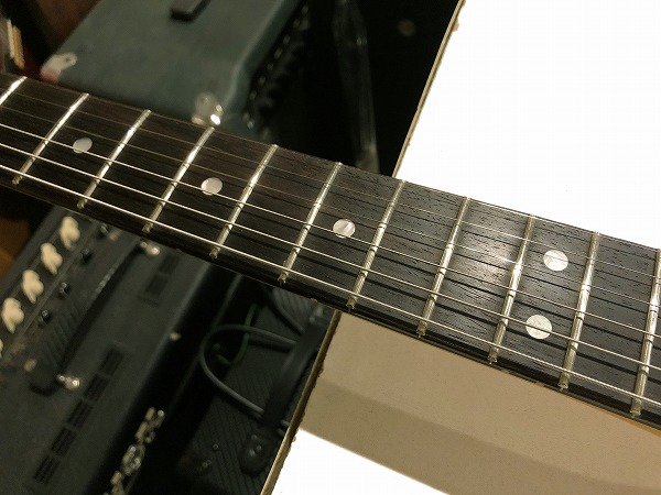 コンディションは非常に良好です。ネックはロッド調整済みで、反りも無く真っ直ぐで良好な状態に調整済です。ロッドはまだ余裕がありますので、今度の調整にも対応します。フレットも大きな減りは無く、まだ9分程度は残っており、へこみや弦溝も一切ありません。さらに丁寧に磨きを入れ、光沢のある綺麗な美品コンディションになっています。指板も減りや大きなダメージは一切無く、さらに丁寧にクリーニング、磨きも行っており、綺麗で良好な美品コンディションになっています。ナットも減り無く、非常に良好なコンディションです。ブリッジサドル弦高調整スタッドビス、オクターブ調整ビスも、錆びつきによる固着等も無く、調整上の動作も良好です。